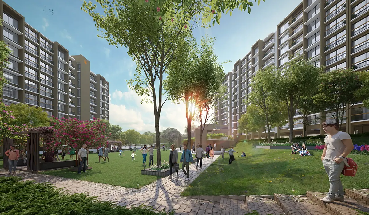 Amenities include clubhouse, sports facilities, community spaces, landscaped areas and daily convenience infrastructure.